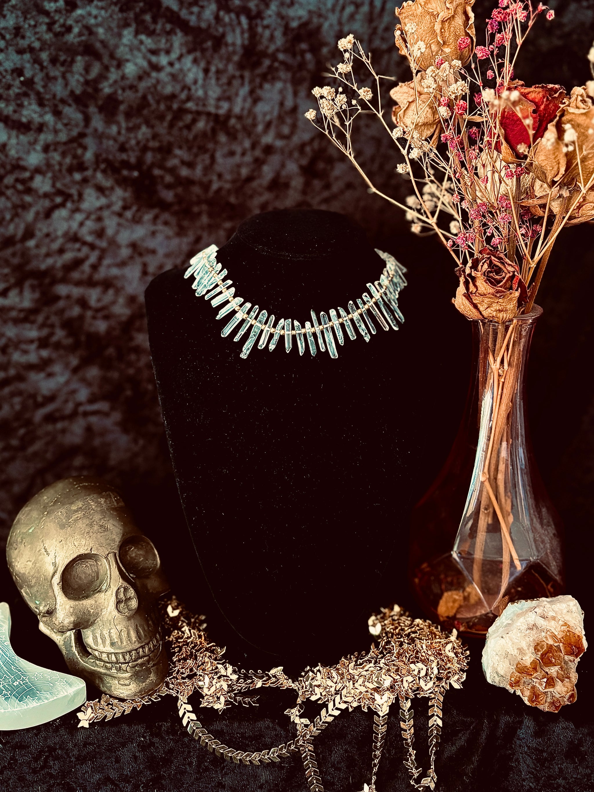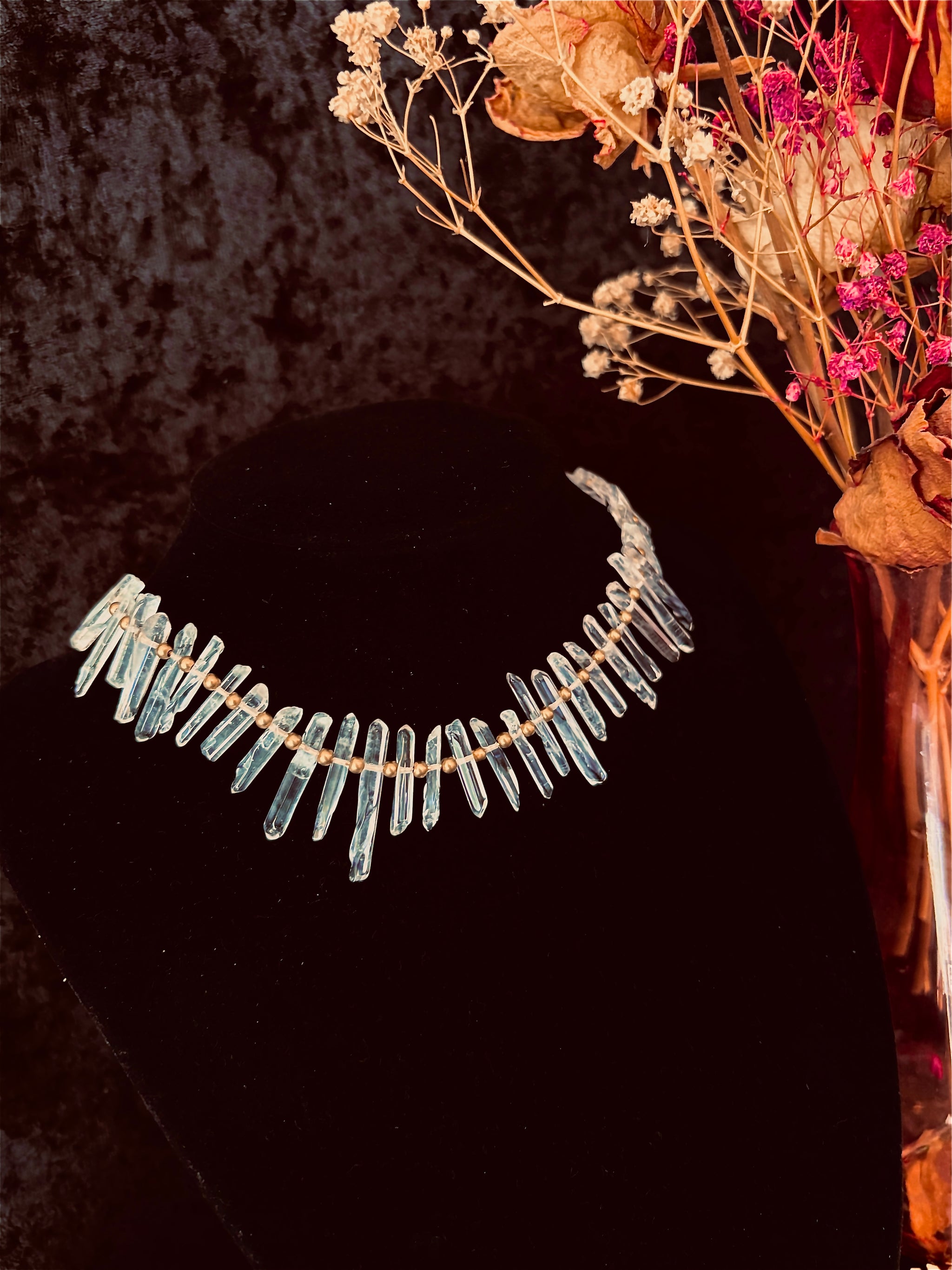 Made with a string of chunky Clear Quartz crystals, on malleable brass wire, embellished with round brass beading. The choker is adjustable with chain and clasp at the back and is absolutely stunning worn high around the neck or lower as a necklace for layering.